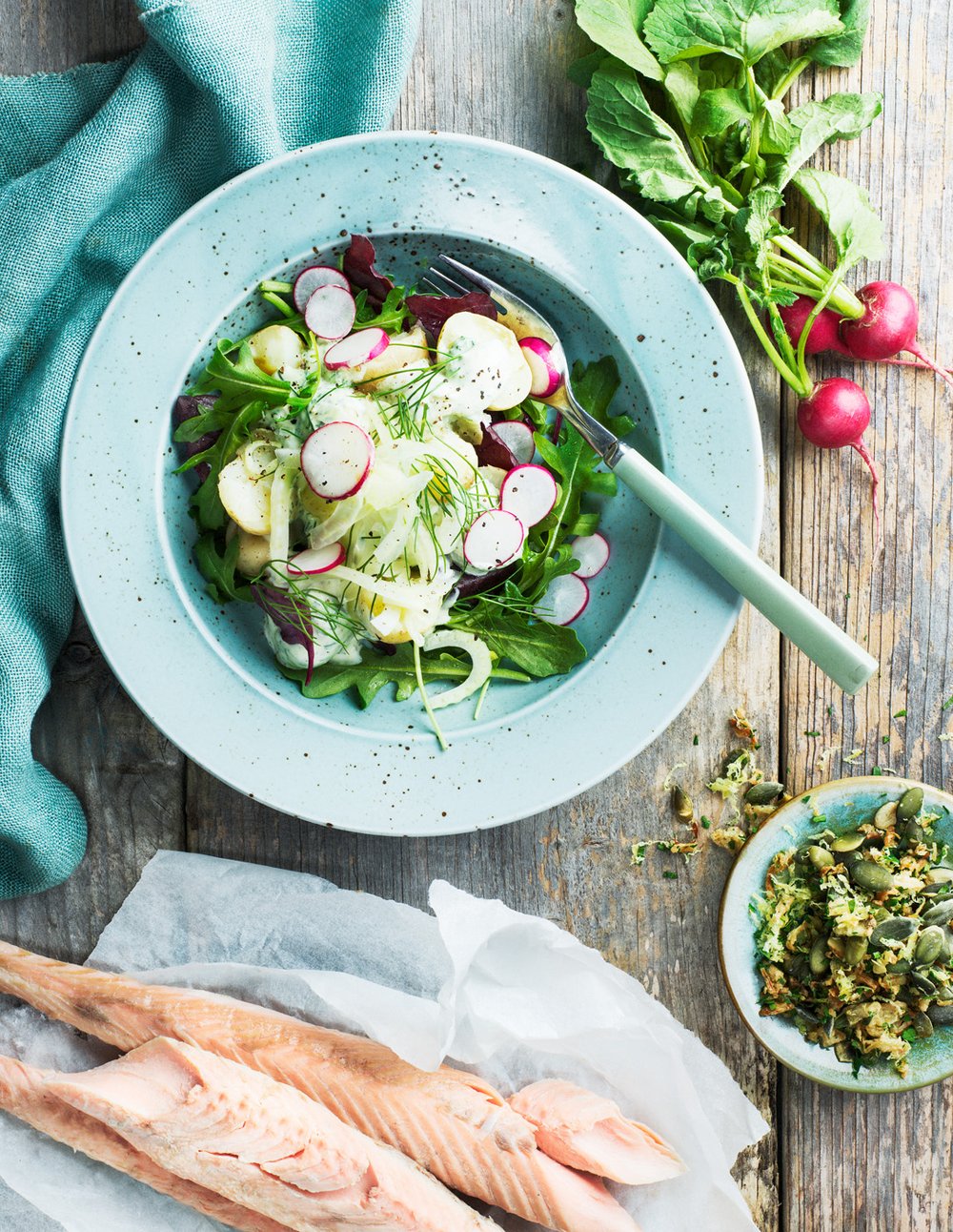 1. Koka färskpotatisen i saltat vatten. Bryt potatisen i mindre bitar när den svalnat något. 2. Blanda ingredienserna till strösslet. 3. Mixa örterna till såsen med sardellerna, senapen och majonnäsen till en grön sås. Rör ner yoghurten och smaka av med salt och peppar. 4. Strimla fänkålen fint men spara dillen. Massera fänkålen med citronsaft och olivolja. Blanda fänkål och potatis lätt med örtsås. 5. Varva potatisen på ett fat tillsammans med sallad och skivade rädisor. 6. Toppa med strösslet och servera t ex lax till.