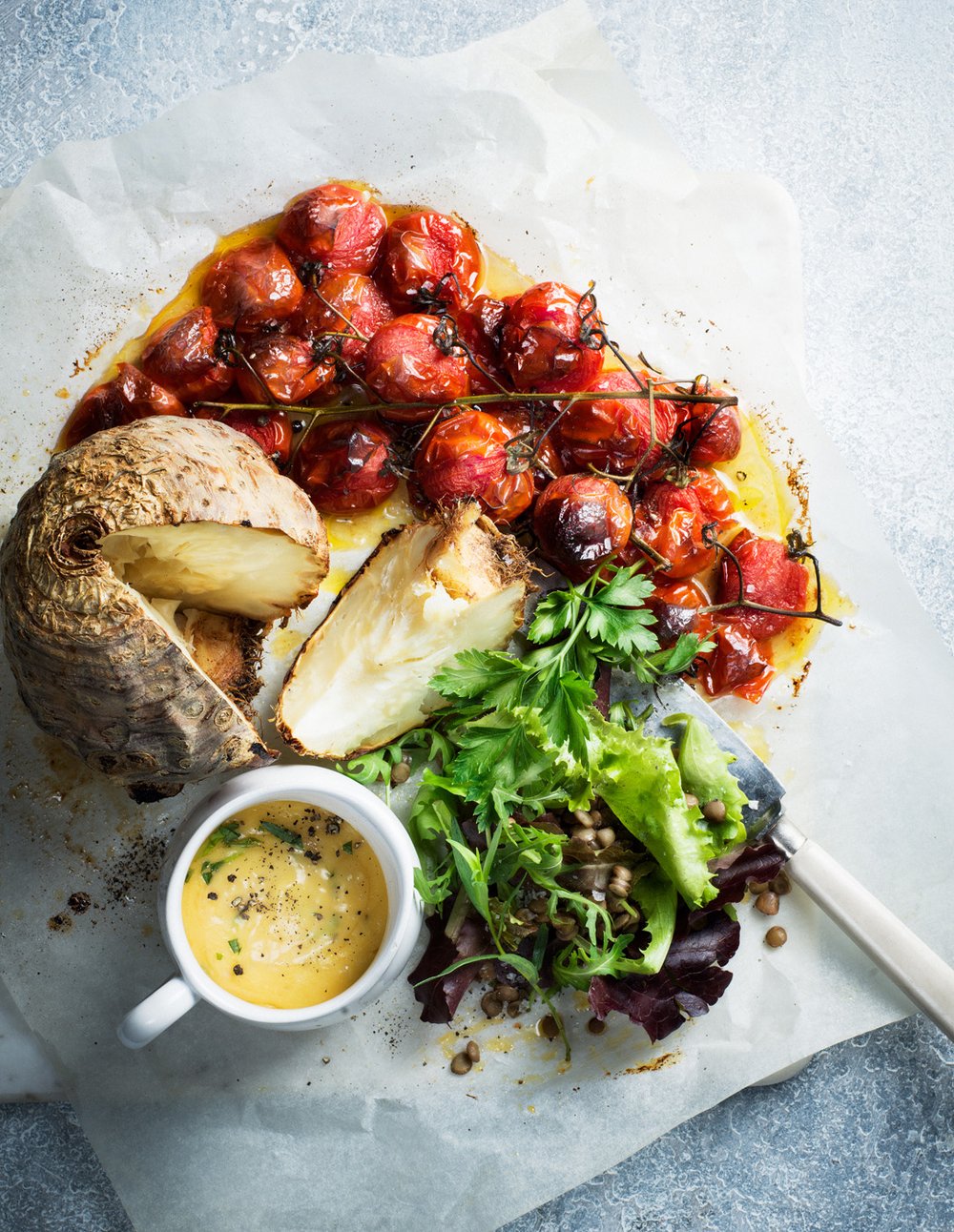 Långbakad rotselleri, bearnaisesås och ugnsbakade tomater Lägg in sellerin hel i ugnen och se hur den förvandlas till en sofistikerad, mjuk och smakrik bjudrätt med hemslagen bearnaise och söta ugnsbakade tomater. En linssallad till ger anrättningen välbehövligt protein och extra fräschör.