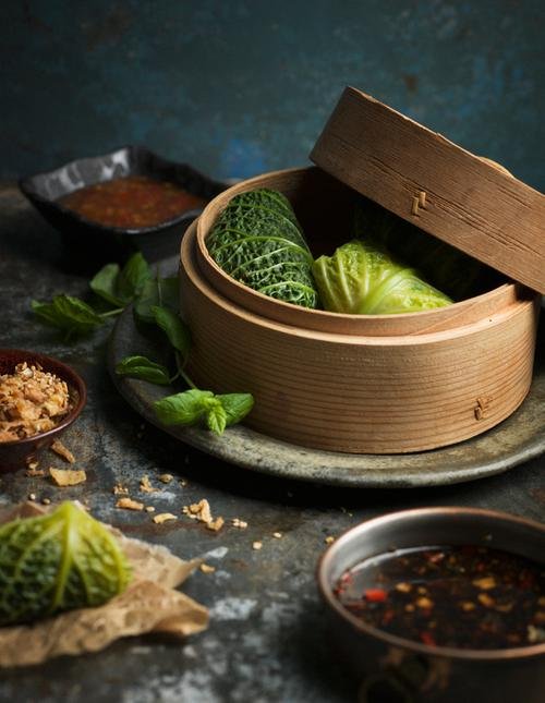 Savoykålsdolmar med ingefära Milda dolmar doppas i en sötsyrlig sås med smak av ingefära. Ljuvlig asiatisk mat som får dig att må bra. Kycklingen kan bytas ut mot lax och skaldjur, fläskfärs eller rökt tofu. 4 portioner