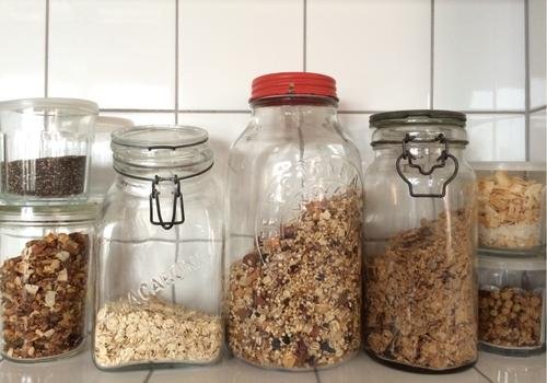 Vår "frukosthylla" med chiafrön, hemgjord granola, havregryn, rostad müsli, köpeflingor, rostade kokosflagor och mullbär.