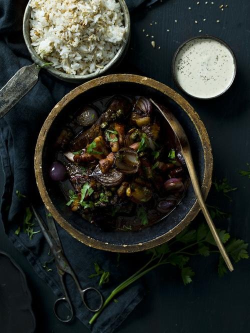 En mörk, mustig och långlagad gryta, nästan som november självt. Med den skillnaden att här finns det solglimtar av smak – kaffe, kardemumma och peppar – och härliga konsistenser. Massor av rödvin behövs, både i grytan och i november.
