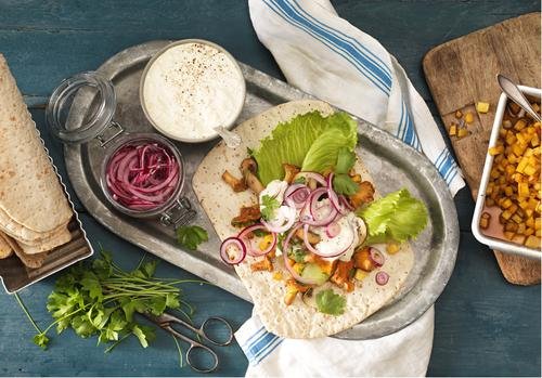Tortilla med sirapsstekt kål, västerbottenkräm och picklad rödlök En ”svensk” tortilla på tunnbröd. Välj svamp efter säsong och plånbok. Syran kommer från den picklade löken och citronskalet. Vill du öka på proteinet (finns lite i svampen och ostkrämen) och få en bättre näringsbalans kan du gärna servera en ärtkräm – varm eller kall – gjord på gula ärter, kikärter eller stora vita bönor till. 4 portioner