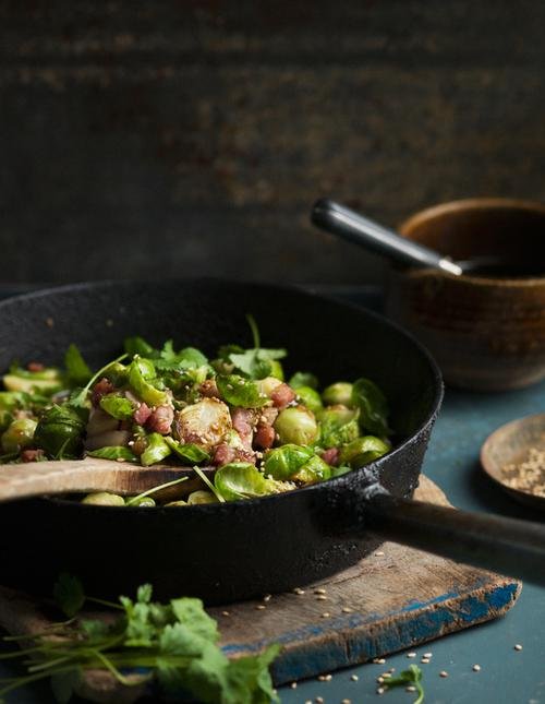 Karamelliserad brysselkål med bacon Den här karamellsåsen är mycket vanlig i det vietnamesiska köket och används till både fisk och fläsk. Här blir den en underbar kamrat till stekt brysselkål. Gott till ankbröst men även kycklingfilé och fläsk. Den som vill gillar het mat strör över lite finhackad röd chili.