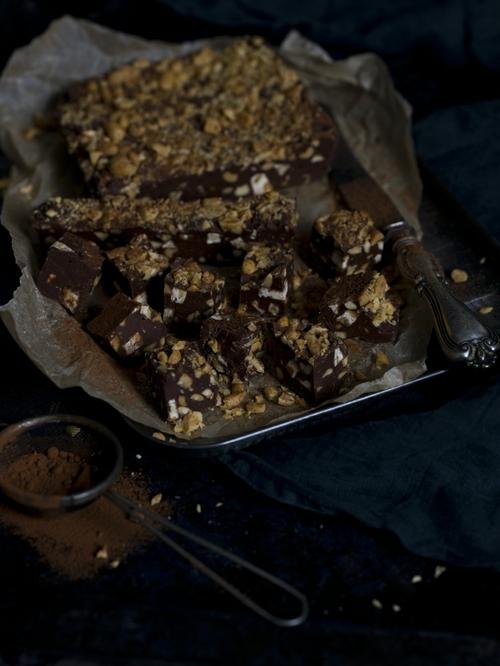 100 g mjölkchoklad av bra kvalitet 100 g mörk choklad 70% 2 dl söt kondenserad mjölk 25 g smör 2 krm äkta vaniljpulver 100 g fransk nougat 1 dl salta jordnötter + 0,5 dl till garnering ev. kakao att pudra över