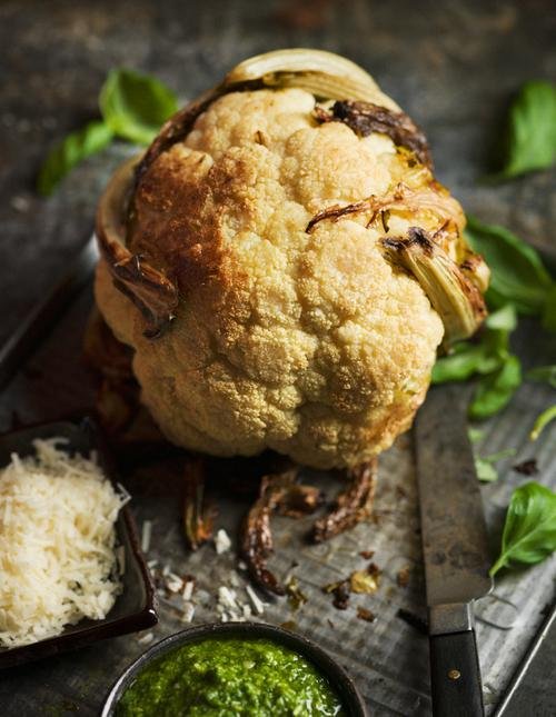 Ugnsrostad blomkål med pesto Snygga kålhuvuden med krispiga blad blir till en fenomenal vegetarisk måltid. Ta hellre två små huvuden än ett stort. Servera som en ensamrätt gärna med lite potatismos. Blomkålen är också god som tillbehör till en stekt biff eller med några mjukkokta ägg och färskpillade räkor. 2-4 portioner