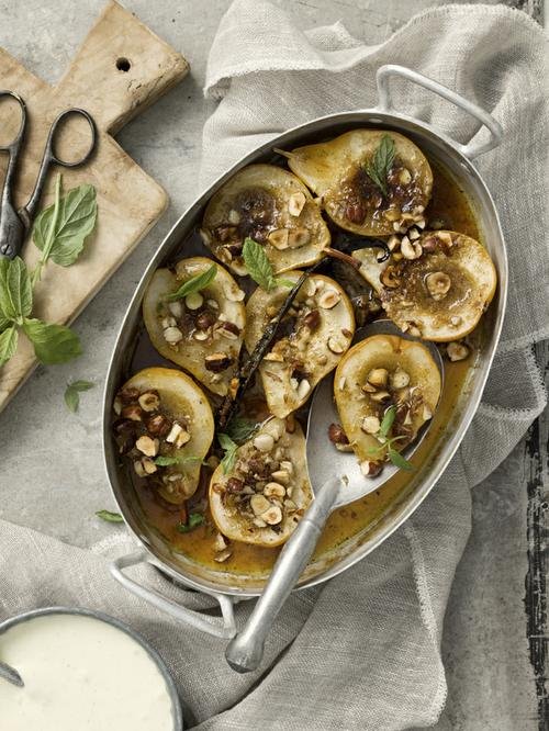 TIPS: Tänk på att päronen torkar till något när du tar ut dem ur ugnen. Är de för mjuka kan du bara stoppa in dem igen. Om du inte vill att päronen mörknar kan du pensla dem lätt med lite citronvatten innan du gräddar dem.
