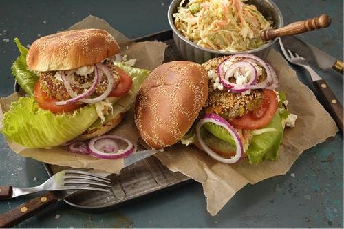 Till servering sallad, skivad tomat och rödlök, fetaost och hamburgerbröd