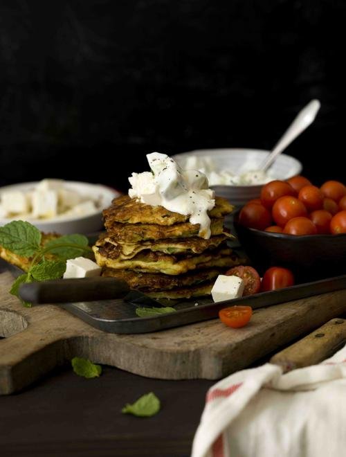 Riv zucchinin grovt och lägg den i en bunke med 1 tsk salt. Låt stå 10 minuter. Krama ur vattnet. Skala palsternackan och riv den grovt. Blanda zucchini, palsternacka, uppvispat ägg och mjöl. Krydda med salt och peppar. Stek 12-16 plättar i rikligt med smör. Skala och kärna ur gurkan. Skär den i halvmånar. Blanda med yoghurt, vinäger och hackad mynta. Smaka av med salt och peppar. Servera plättarna med tomater, skivad lök och ost i bitar.