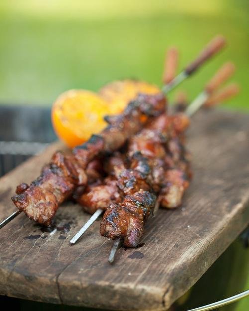 800 g fläskkarré 6-8 st Grillspett 1,5 dl Glaze 2 st apelsiner att grilla Skär fläskkarrén i stora tärningar. Krydda med salt och svartpeppar och trä upp på spett. Pensla med glaze mot slutet av grillningen. Dela apelsinerna och lägg på grillen med snittsidan nedåt. Grilla tills de har fått fin färg.