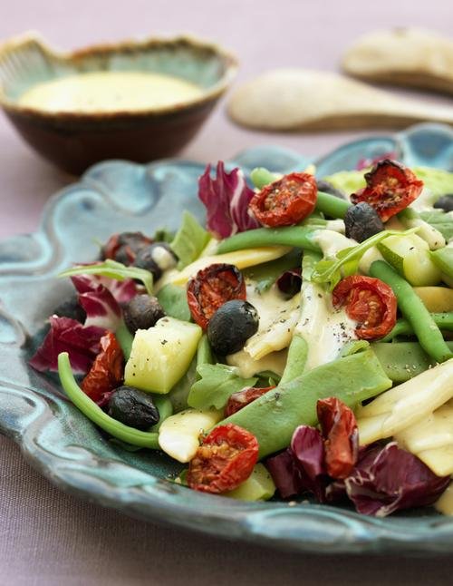 Bönsallad med torkade tomater och tonnatasås Har du bråttom kan du strunta i att torka tomaterna eller vrida upp värmen till 175 grader. 4 portioner