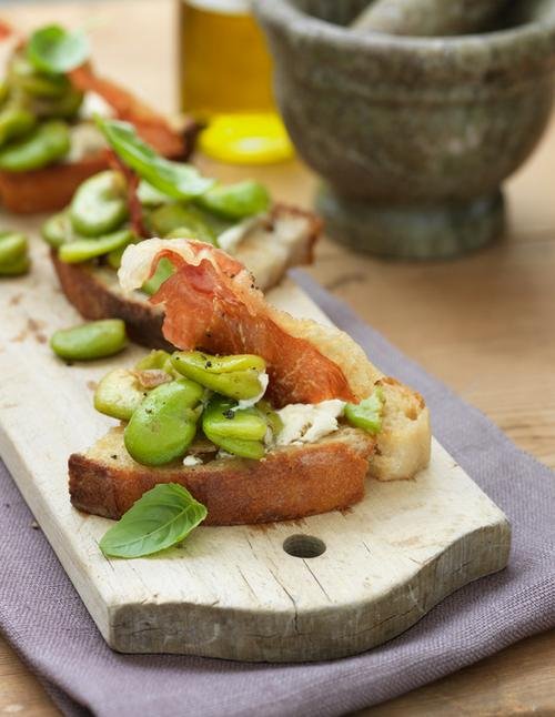 Sprita bondbönorna och koka dem i lättsaltat vatten ca 10 min. Spola kallt och tag bort skalet. Torka parmaskinkan på bakplåtspapper i ugn, 150° i ca 10 minuter. Låt svalna. Blanda ricotta med olivolja och svartpeppar. Stek lantbrödet i smör. Fräs vitlöken i smör, tillsätt bönorna, krydda och låt dem bli varma. Klicka lite olivkräm på varje brödbit. Toppa med vitlöksstekta bondbönor, en bit skinka, basilika och svartpeppar.