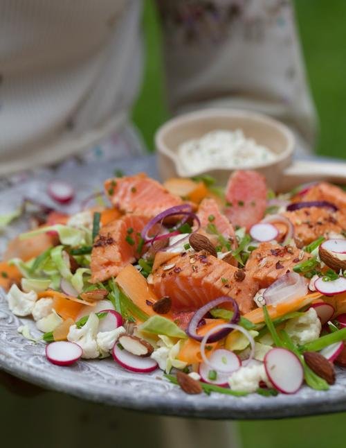 Primörsallad, dragonkräm och kryddstekt lax Lite hetta och lakritstoner i ruben passar fint till laxen och de krispiga grönsakerna. Salladen blir extra matig med kokt färsk potatis eller matvete. 4 portioner