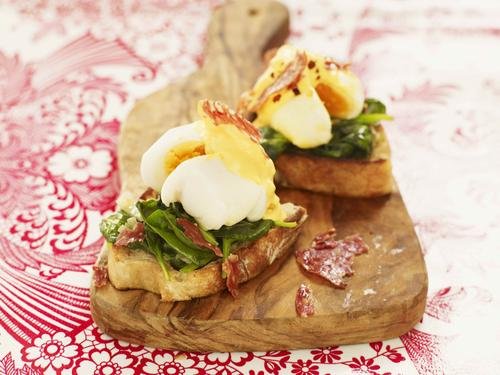 4 skivor lantbröd 8 skivor salami, tunt skivad 1 st gul lök 1 st vitlöksklyfta 300 g bladspenat 2 msk smör-& rapsolja 4 st ägg 2 liter vatten 1 msk ättikssprit 12% 1 msk salt 1 dl crème fraiche gourmet saffran & tomat chiliflakes, flingsalt, svartpeppar