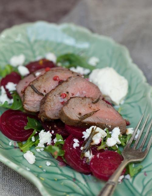 2 knippor färska rödbetor 500 g lammfiléer, inner- eller ytterfilé 2 tsk torkad rosmarin eller 2 kvistar färsk 1 msk rosépeppar 2 st vitlöksklyftor 100 g rucola 50 g fetaost olja och smör till stekning