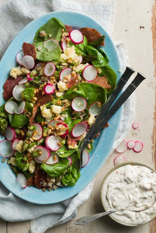 Koka matvetet i buljongen ca 15 min. Låt svalna. Bryt av den nedre delen på sparrisen. Skär av knopparna och skiva resten tunt. Blanda samman ingredienserna till dressingen och häll den över sparrisen. Låt marinera ca 15 min. Blanda ingredienserna till såsen och låt den stå kallt till servering. Sätt ugnen på 225°. Fördela salamiskivorna på en plåt med bakplåtspapper. Stek dem i övre delen av ugnen ca 5 min tills de är krispiga. Låt kallna och bryt dem i bitar. Rosta pinjenötterna i en torr varm stekpanna under omrörning. Bryt osten i bitar. Skiva rädisorna tunt. Varva grönsaker och matvete på ett fat. Strö över ost, nötter och salami. Servera med såsen.