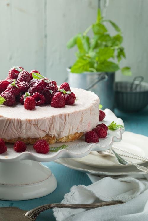 Garnering: hallon eller jordgubbar, mynta, florsocker