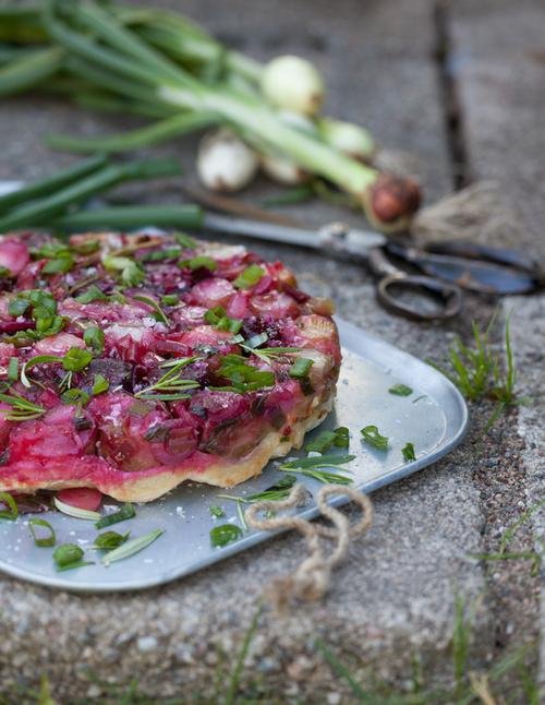 Tarte tatin med getost, färskpotatis och rödbetor Klassiska smaker som getost och rödbetor samsas med de nyskördade potatisarna i en härlig tarte inspirerad av den klassiska franska äppeldesserten tarte tatin. 6 portioner