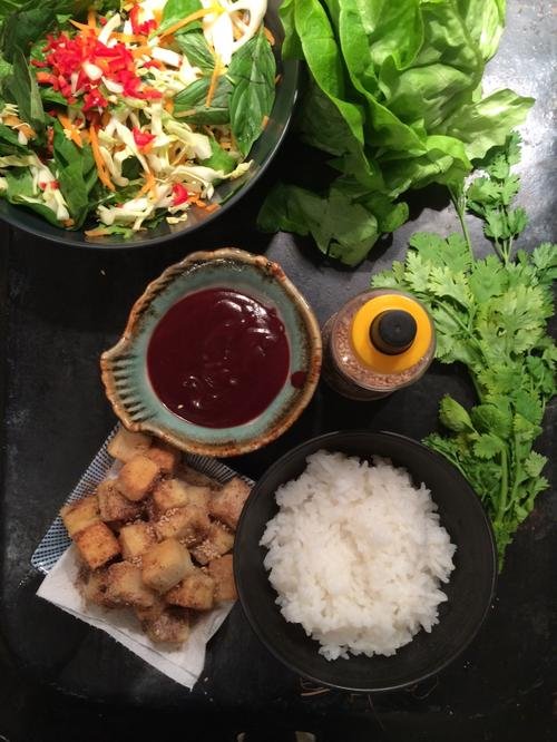 Koka riset enligt anvisning. Smaksätt ev hoisinsåsen med limesaft, finhackad vitlök och lite ljus soja. Rosta jordnötterna i en torr stekpanna. Hacka dem grovt. Rosta sesamfröna och blanda med sesamfröna. Skala, skär och riv grönsakerna i mindre bitar om det behövs. Skölj och repa örterna och blanda med grönsakerna till en sallad. Häll över sesamoljan. Separera och skölj salladsbladen. Blanda salt, socker och svartpeppar till kryddsaltet. Skär tofun i tärningar. Värm upp oljan till 180 grader. Frityrstek/fritera tofun krispig och gyllenbrun ca 5 minuter. Lägg tärningarna på ett papper så att överflödig olja rinner bort. Strö över kryddsaltet. Strö lite av nötterna över tofun och blanda resten med riset eller servera de till. Servera tofun med hoisinsås, ris, sallad, ev nötter och salladsblad som du rullar ihop till små *sallads-tacos”.