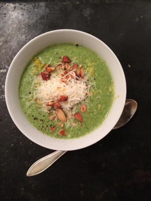 Grön vårvinter soppa med citron och mandel Rökta mandlar kan bytas ut mot vanliga mandlar, cashewnötter, stekta brödkrutonger eller rostade kikärter. Huvudsaken är att det är något som knaprar.