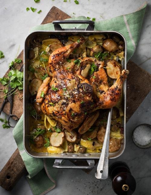 Kyckling med jordärtskockor och oliver i citronsky Ljuvlig smak av citron och oliver i en kycklingrätt som sköter sig själv i ugnen. Syran i citronen balanseras av de söta, nötiga jordärtskockorna. Servera med vildris, pasta eller bara ett gott bröd. Välj gärna en ekologisk kyckling om du har möjlighet. Lagom till 6 hungriga.