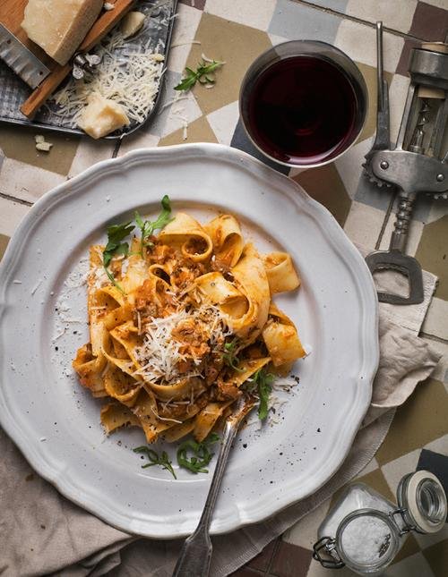 Skala och finhacka löken. Fräs den mjuk i olja ca 5 minuter på medelvärme. Skala moroten och tärna den fint. Skiva sellerin och tärna sidfläsket. Låt grönsakerna och fläsket fräsa med många minuter. Tillsätt köttet, kryddorna, tomatpurén och vinet. Späd med 4 dl vatten. Låt koka ca 1 timme utan lock. Tillsätt mjölken och låt koka ca 30 minuter ytterligare tills köttet är mjukt. Späd ev. med mer vatten om det kokar torrt. Smaka av med salt och peppar. Blanda med pasta och servera riven ost till. Garnera ev. med färska örter.