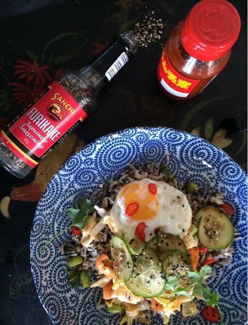 I det här receptet kommer proteinet från flera källor – sojabönor, gröna linser, ägg och tofu. Du behöver inte välja alla tre utan kan strunta i tofun om du inte har kommit överens med den än. Jag fuskar mig fram till smaken av kimchi genom att använda en färdig smaksättning – kimchee base. Man kan fuska finurligare genom att använda mjölksyrade grönsaker på burk (t ex av märkena Syrat eller Tistelvind eller surkål på burk) så blir det ännu nyttigare men jag hade inte några sådana hemma. Självklart kan man också vara ambitiös och göra sin egen syrade kimchi.