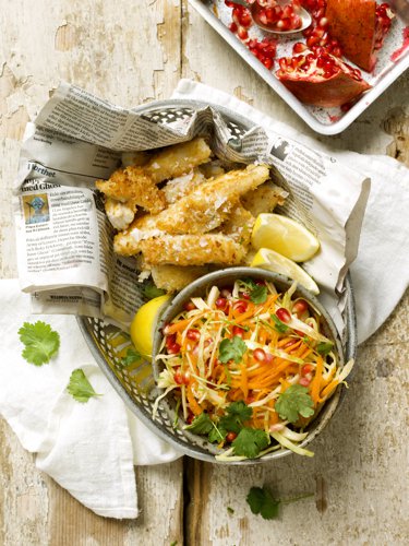 Tina fisken enligt anvisning på förpackningen. Fortsätt med salladen. Dela, kärna ur och finhacka chilin. Blanda med övriga ingredienser till dressingen. Smaka av med salt och peppar. Skär bort den hårda mittstocken på vitkålen. Strimla vitkålen fint. Skala och riv morötterna grovt. Blanda de rårivna grönsakerna med dressingen. Strö ev över lite hackad koriander. Skär fiskfiléerna i bitar. Vänd i panko eller vanligt ströbröd blandat med salt och peppar. Stek fisken i smöret ca 3 minuter på varje sida. Servera med vitkålssalladen och citronklyftor.