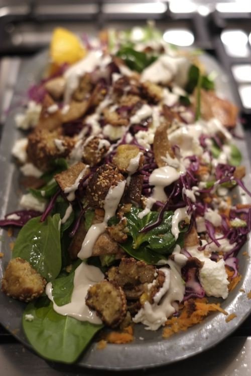 Falafelsallad med tahinidressing och krispigt pitabröd Falafel ena dagen och falafelsallad en annan dag – ett bra sätt att ta till vara rester. Det är svårt att hitta riktigt gott pitabröd i Sverige tycker jag. Har du en kran, köp några paket och lägg i frysen, där du även kan förvara falafeln. Pitabrödet fyller sin funktion att göra falafeln handhållarvänlig men är i ärlighetens namn inte särskilt upplyftande. Glädjande nog blir det krispigt och en perfekt salladsingrediens när man steker det. Gott till dressingen med lite brända toner och syrlig fetaost.