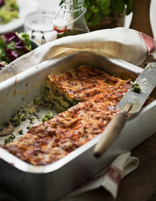 Många receptmakare hävdar att umami är allt och brukar stapla umamistinna råvaror på varandra. Umami är det som brukar beskrivas som den femte smaken och finns i allt från tomater och parmesanost till pasta, svamp och buljonger. Jag gillar umami men är inte en överlastare utan brukar snarare fokusera på konsistens och balans mellan sött och surt. Det här är dock ett lysande undantag – en lasagne med umami från både svamp, ärtor och ost. Med smak av getost och spenat och en len och oumbärlig bechamelsås smakar den ljuvligt.