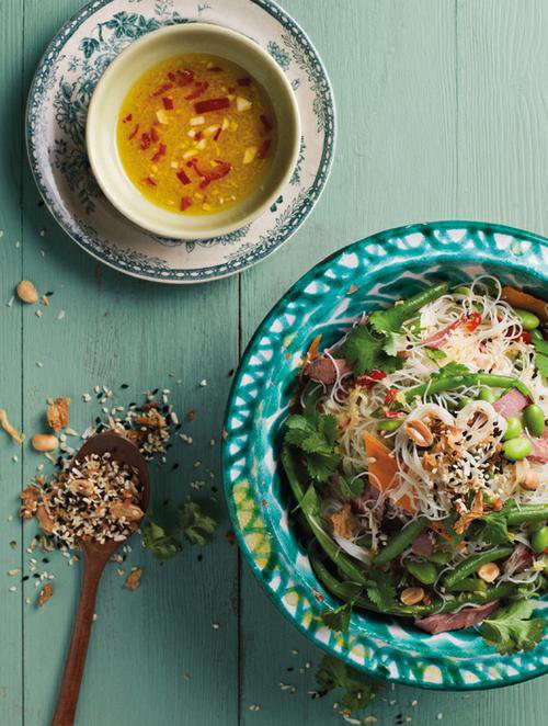 Koka/tina de båda bönorna enligt anvisning på förpackningarna. Koka risnudlarna och spola dem kallt. Skala och skär morötterna i tunna strimlor, gärna med en mandolin eller en osthyvel. Strimla rostbiffen. Blanda samman ingredienserna till dressingen. Rosta allt till strösslet förutom den friterade löken i en torr stekpanna under omrörning. Låt svalna och blanda ned löken. Blanda grönsaker, nudlar och dressing. Toppa med strössel och koriander.