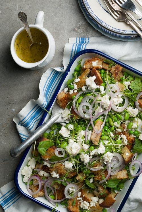 Bryt brödbitarna i mindre bitar och stek dem gyllenbruna i smör- och rapsolja. Tina sojabönorna och ärterna. Skär bort den nedre delen av ärtskotten. Strimla myntabladen grovt. Skiva rödlöken tunt. Blanda alla ingredienser på ett stort fat, smula över fetaosten. Blanda ingredienserna till dressingen och häll den över salladen vid servering.