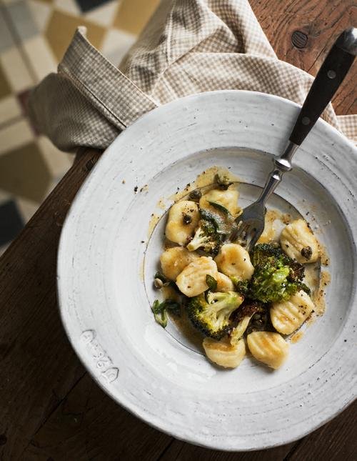 Gnocci med brynt salviasmör och rostad broccoli Som bomull för magen är de mjuka små potatiskuddarna. Bra balans mellan smak och konsistens blir det när de serveras med ett nötigt smör med syrlig kapris och hårt rostad broccoli. Det är lite pilligt men väl värt mödan. Den som inte oroar sig för vikten gör dubbel sats av kaprissmöret.