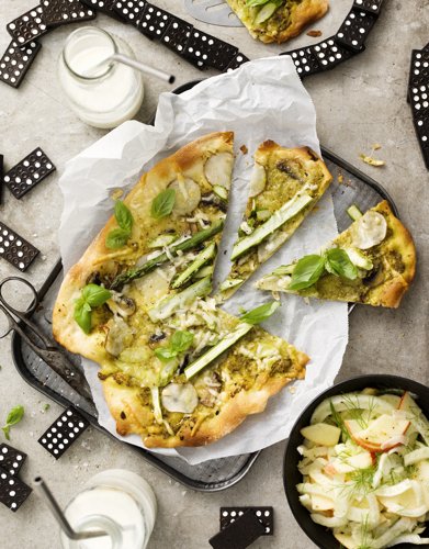 Pizza verde med pesto och jordärtskockor, fänkålssallad Egen pizzadeg tar inte särskilt lång tid att göra men är hundra gånger godare än färdiga mixer. När sparrisen inte är i säsong blir det gott med broccoli, grönkål eller svartkål.