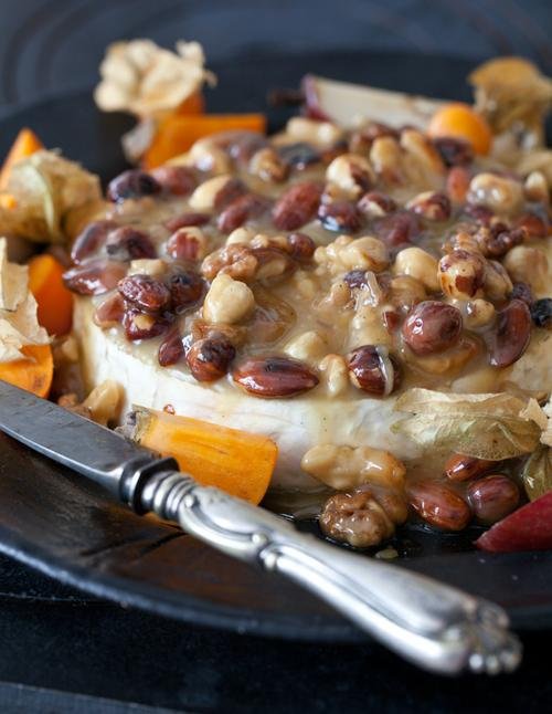 1 liten brietårta á 600 g 200 g mandel, valnötter och hasselnötter, ca 3 dl 200 smör 1 dl strösocker 0,5 dl honung 2 msk vetemjöl sharonfrukt, physalis och päron till garnering rågbröd till servering