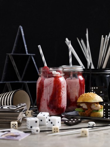 Gör gärna eget hamburgerbröd t ex efter det här braiga receptet .Knepet för att få till krispiga sötpotatisklyftor är att skära klyftorna tunt, ha relativt mycket olja och hög värme. Och den där krispiga kycklingen vet ni väl redan hur ni ska få till? Ja, just det köp kyckling med skinn och stek skinnsidan först. Det där snygga rosa på bilden är hallonmilkshake med marshmallows. Alldeles för onyttigt för den här bloggen:-)