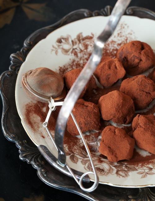 Finhacka chokladen och lägg den i en bunke. Dela passionsfrukterna och skrapa ur innanmätet i en kastrull. Häll på grädden och honungen och koka upp under vispning. Sila passionsfruktsgrädden över chokladen. Vispa krämen blank. Ställ in i kylen ca 3 timmar. Rulla till kulor med hjälp av två skedar, ett kuljärn eller ett teskedsmått. Pudra över kakao och rulla runt så att tryfflarna täcks. Ställ kallt till servering men njut dem rumstempererade.
