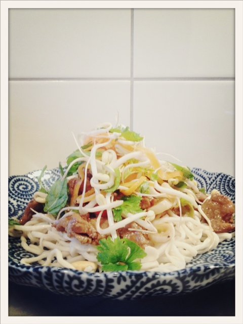 Strimla köttet tunt. Hacka citrongräset och vitlöksklyftorna fint. Blanda med köttet och häll på fisksåsen, socker och svartpeppar. Marinera ca 10 minuter medan du gör i ordning resten. Riv morötterna och strimla rättikan. Blanda dem med böngroddar och färska örter. Skölj nötterna om du använder salta. Rosta dem lätt i en torr stekpanna. Hacka och blanda dem med grönsakerna. Koka nudlarna enligt anvisning på förpackningen (du kan koka dem al dente och spola dem kallt. Vid servering doppar du dem snabbt i kokande vatten). Stek köttet i en stor stekpanna eller en wok i lite olja. Smaksätt med sojan. Vänd eventuellt ned finhackad chili. Toppa nudlarna med köttet och köttet med toppingen!