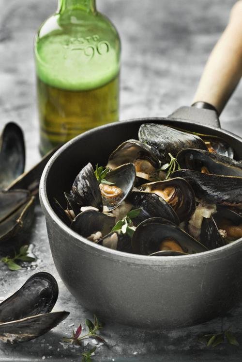 Blåmusslor med äpple, bacon och öl Perfekt som en förrätt til 4 eller middag till 2. Måste avnjutas med ett bröd så att man kan sörpla upp den goda såsen. Den som vill bli riktigt mätt plussar med pommes frites eller vänder ner musslorna i nykokt spaghetti.