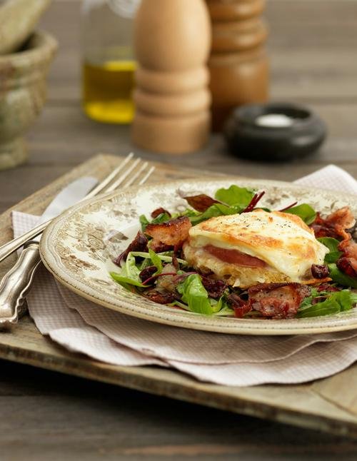 6 skivor vitt toastbröd eller lantbröd 1-2 st röda äpplen, 6 skivor getost, ca 300 g 1 paket bacon 1 msk vit balsamvinäger 2 msk olivolja 2 tsk lönnsirap eller honung 1 tsk fransk senap 100 g sallad 2 msk torkade tranbär Smör till stekning Salt, peppar