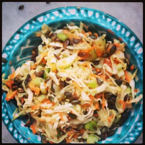 Strimla kålen fint, gärna med osthyvel. Skala och grovriv moroten. Skär sellerin i mycket tunna skivor och strimla salladslöken. Blanda samman ingredienserna till dressingen. Krydda med salt och peppar. Hacka koriandern, även stjälkarna. Blanda grönsaker och dressing och strö över hackad koriander och pumpakärnor.