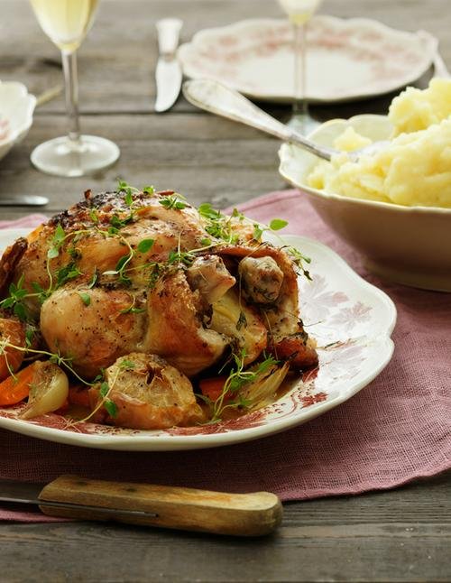 4 portioner 1 st kyckling, ca 1 kg 3,5 dl cider, torr t ex Stowford Press 0,5 % eller färskpressad äppeljuice 1 dl kycklingbuljong 50 g smör 2 st lökar 3 st morötter 4 st små äpplen eller 2 stora 0,5 kruka färsk timjan, repad