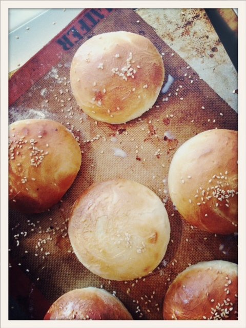 Äntligen fick jag tid till att baka Hårdrockar-Jons fina hamburgerbröd. Jag gjorde hälften som minibröd och hälften i vanlig storlek. Bröden var mjuka, fluffiga och lagom söta och smakade som en blandning mellan brioche och irländskt potatisbröd. Inte så konstigt med tanke på att det var både potatismospulver, ägg och smör i. Tummenupp och definitivt bästa hamburgerbrödet som jag har ätit!