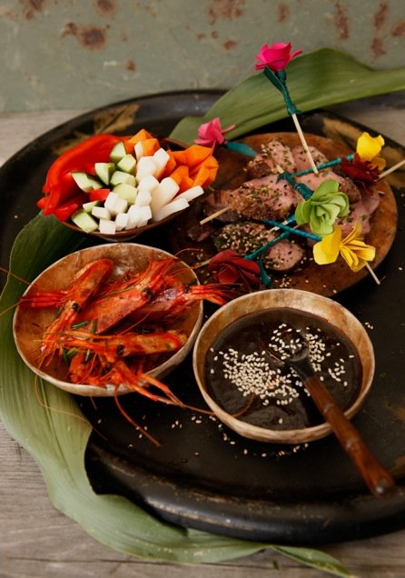 Blanda hoisinsås, olja, sirap och soja i en skål. Rosta sesamfröna i en torr stekpanna. Blanda fröna i såsen när de har svalnat något. Ställ kallt. Sätt ugnen på 175°. Skär rutor i fettsvålen på ankan. Krydda med kanel, salt och nymalen svartpeppar. Stek ankan i olja på svålsidan tills den är knaprig. Vänd och stek köttsidan lätt. Sätt in ankan i ugnen, ca 8 minuter tills innertemperaturen är 56°. Linda in köttet i folie och låt vila ca 10 minuter innan du skivar upp det. Skala räkorna men låt gärna huvudet sitta kvar. Skala och skär grönsakerna i stavar. Arrangera räkor, grönsaker och ankkött på fat eller i individuella dipskålar med såsen i botten.