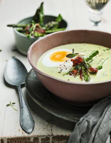 Sparris- och grönärtsoppa med ägghalvor En slät lyx-soppa som går bra att förbereda innan festen. Mixa då gärna soppan med 1 dl mjölk vid serveringen så blir den skummig och fin. Lagom till 4-6 personer.