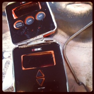 Jag gillade aldrig min termometer (hade inte någon avochpåknapp = batterislut) men det var väl lite onödigt att stoppa in den i ugnen. Smälta batterier känns inte så nyttigt. Dessutom var det en fungerande termometer när batterierna väl var bytta. Suck. Någon som har tips på ett bra märke?