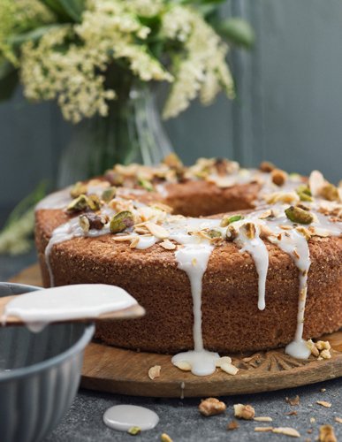 Häll yoghurten i ett kaffefilter och låt stå ca 1 timme så att vasslen rinner bort. Tvätta och riv skalet av citronen och pressa ur saften. Blanda den avrunna yoghurten med citronsaft, citronskal, flädersaft och florsocker. Justera med mer florsocker tills den blir lagom syrlig. Toppa kakan med frostingen och garnera med nötter.
