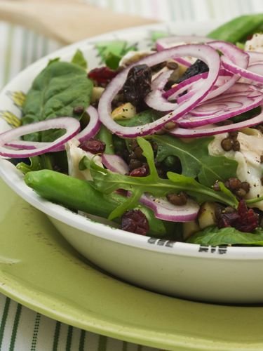 Koka INTE linserna enligt anvisning på förpackningen. Koka dem så här. Koka bönorna och sugar snapsen tills de är al dente. Blanda samman honung, vinäger, rapsolja, salt och peppar till dressingen. Häll dressingen över linserna och bönorna medan de är varma. Skär äpplet i och löken i skivor. Bryt osten i bitar och stek den om du använder halloumi. Vänd ner allt tillsammans med salladen. Garnera salladen med torkade bär.
