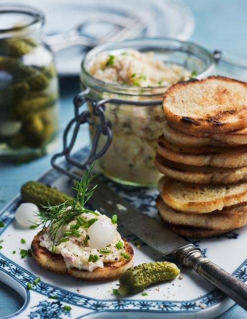 Till servering: baguette, skuret i tunna skivor och smörstekt cornichons och syltlök färska örter t ex bladpersilja, gräslök och dill till garnering