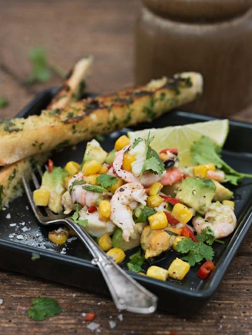 Börja med dressingen. Kärna ur och finhacka chilin. Hacka löken. Blanda allt med socker och limejuice. Smaka av med lite salt. Ställ åt sidan. Skär brödet I avlånga stavar. Blanda samman övriga ingredienser till vitlökssmöret. Krydda med salt och peppar. Smöra alla sidor av brödet med vitlökssmöret och stek det ca 5 minuter tills brödet är rostat. Rosta majsen I en stekpanna med oljan tills den blir gyllenbrun. Låt svalna. Skär skaldjuren och avokadon i mindre bitar. Hacka koriandern, även stjälkarna fint. Blanda samman allt med dressingen precis innan servering. Smaka av med salt och svartpeppar. Garnera med korianderblad och servera vitlöksbröd till.