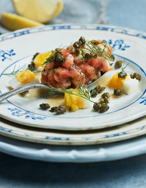 Laxtartar med friterad kapris Skvätt gärna över lite citronsaft vid servering, det ger syra och gör att fisken upplevs som kokt. Lagom till 8 förrättsskedar eller 4 förrättstoaster.